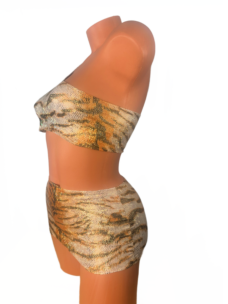 One Shoulder Tan Tiger Print Micro Skirt Set